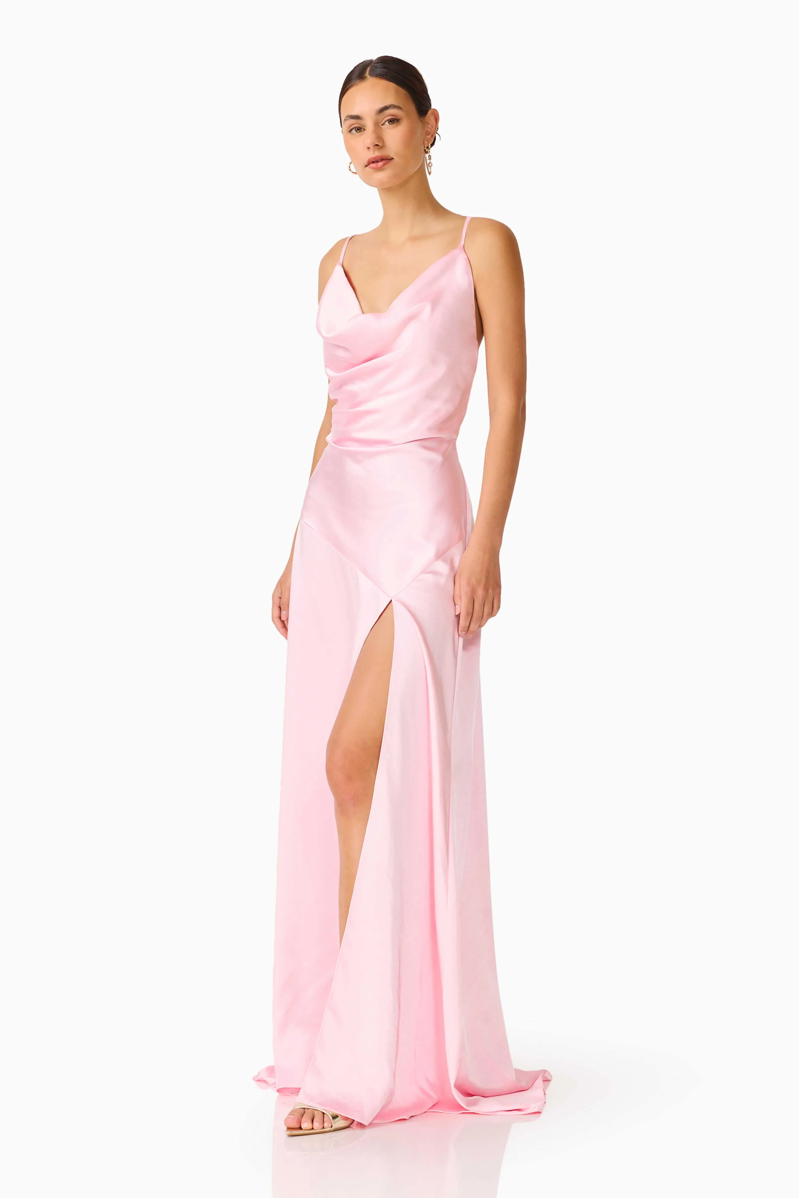 The Clementine Cowl Neck Gown in Pale Pink is a graceful choice for bridesmaids, wedding events, and formal occasions. Designed with flowing drape satin, this gown creates an elegant silhouette that moves beautifully and photographs effortlessly for special celebrations.