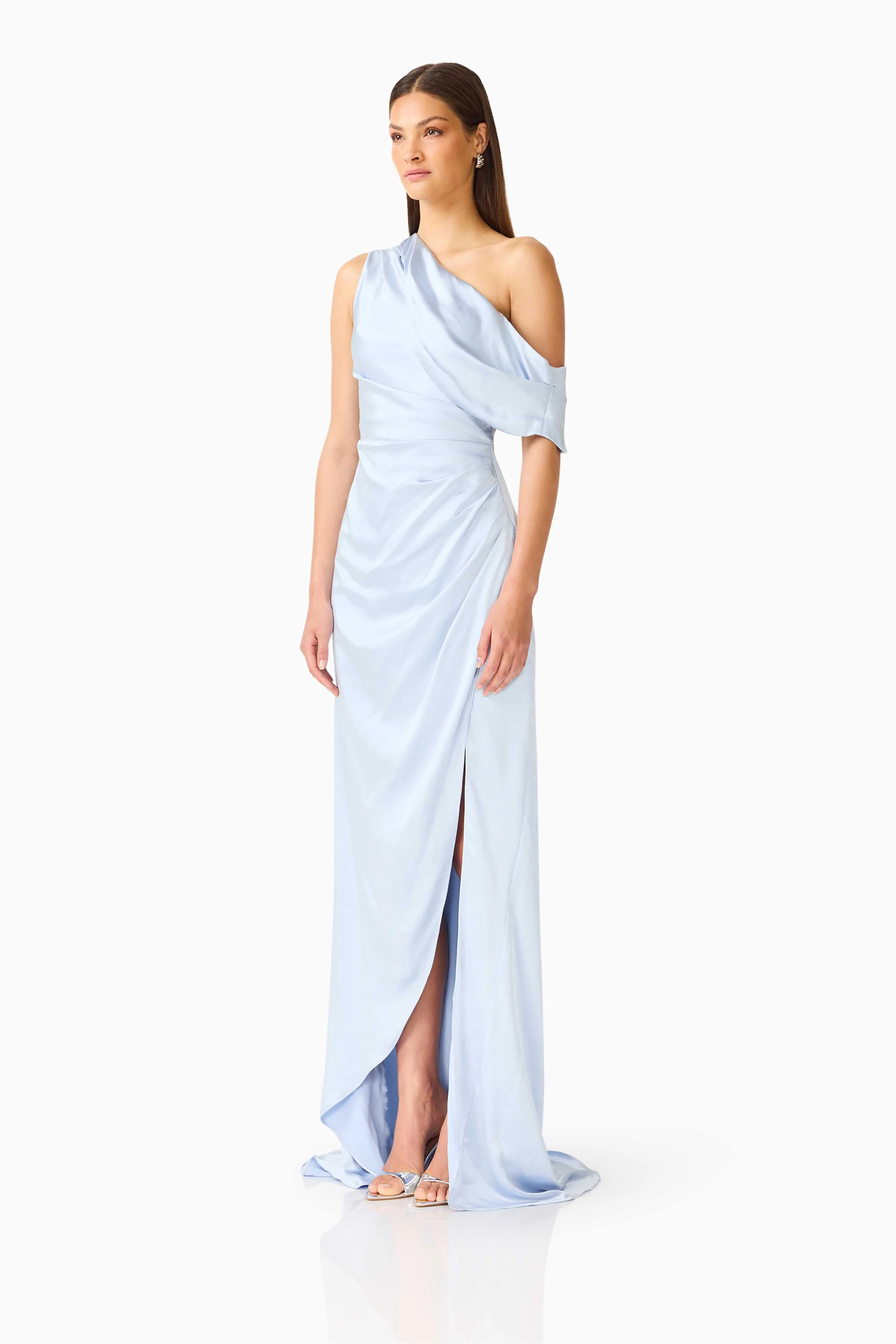 With its one-shoulder detail, flowing drape, and flattering fit-and-flare shape, the Isadora Off The Shoulder Gown in Pale Blue is a timeless, sophisticated choice for any special occasion.