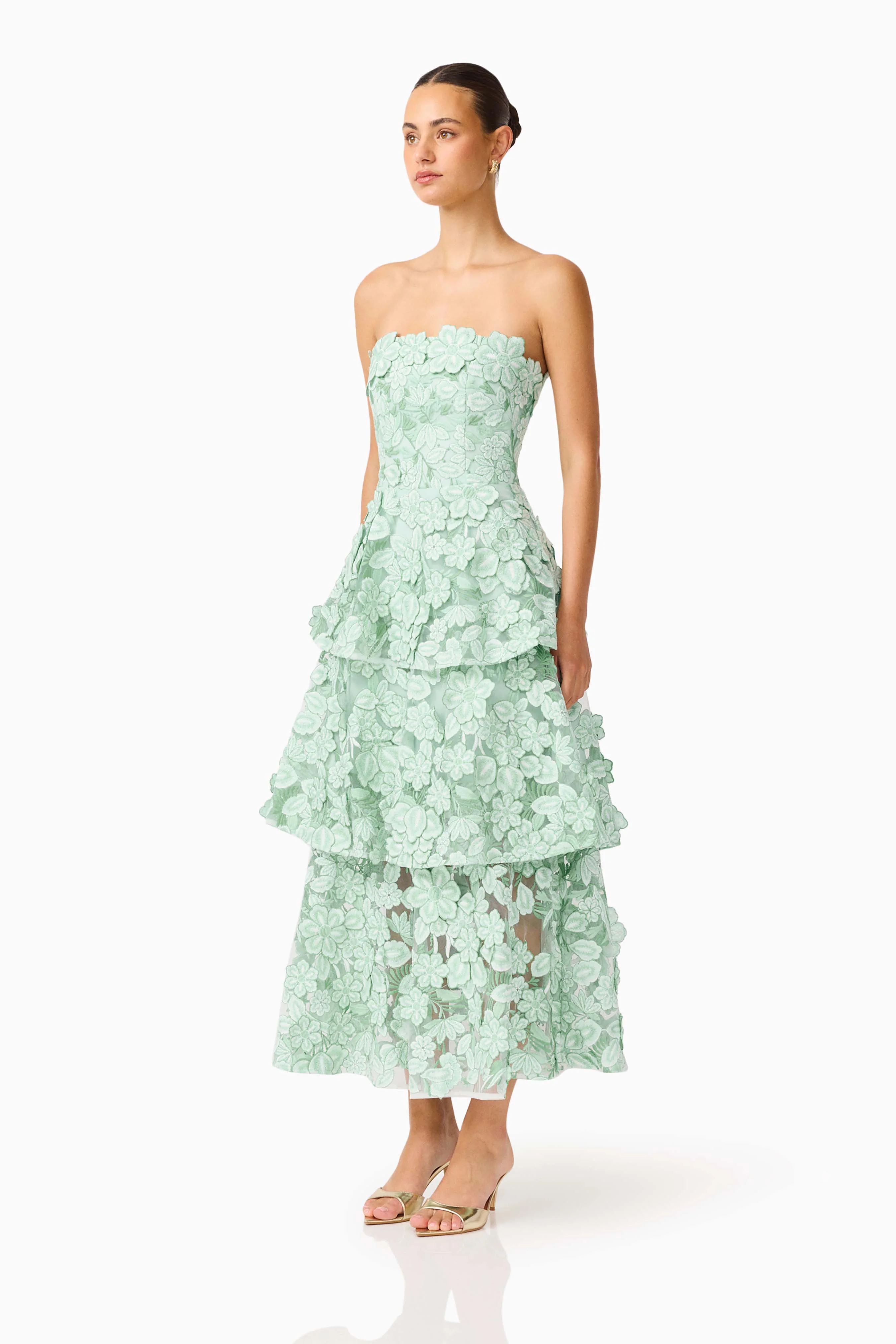 The Roseate Tiered Maxi Dress in Mint Green is a stunning statement piece perfect for weddings, cocktail parties, and elegant evening events. Designed with a fitted bodice and detachable spaghetti straps, it offers versatile styling options—wear it strapless for a chic look or add the straps for added support. The straight neckline is adorned with delicate 3D floral motif details, lending a feminine and romantic touch to the overall design.